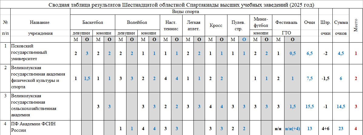 ИТОГИ Шестнадцатой областной Спартакиады высших учебных заведений (ВУЗов) за 2025 год.